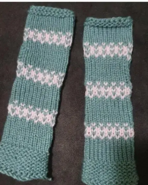 Bonitos mitones y gorro rosa con gris tejidos a mano, ideales para esta temporada de frío.