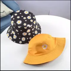 Precioso gorro pescador reversibleDe un lado es amarillo con una florecita 🌼Al voltearlo es negro con varias flores tal como en la imagen