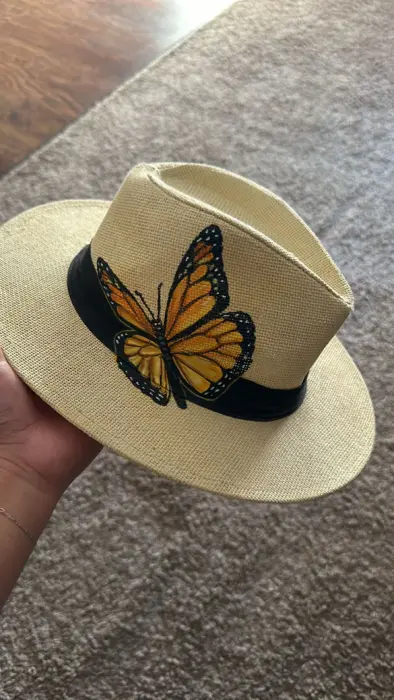Lindo sombrero moderno, pintado a mano con mariposa artesanal y