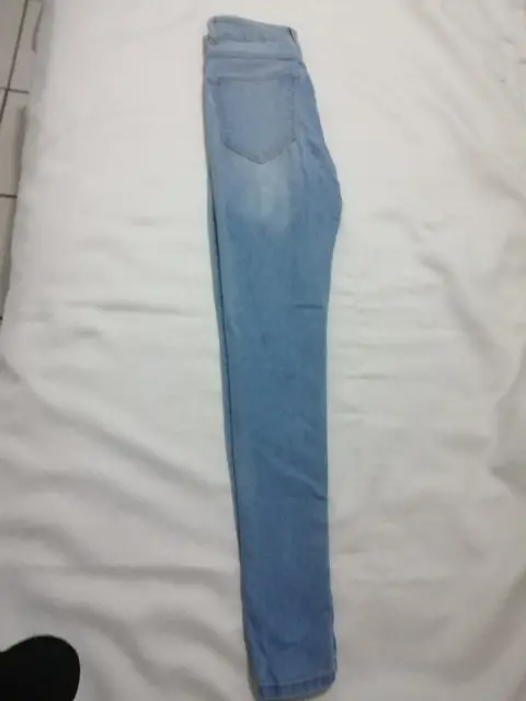 Jeans entubado, azul mezclilla claro, bolsas traseras, talla 5, largo 100cm