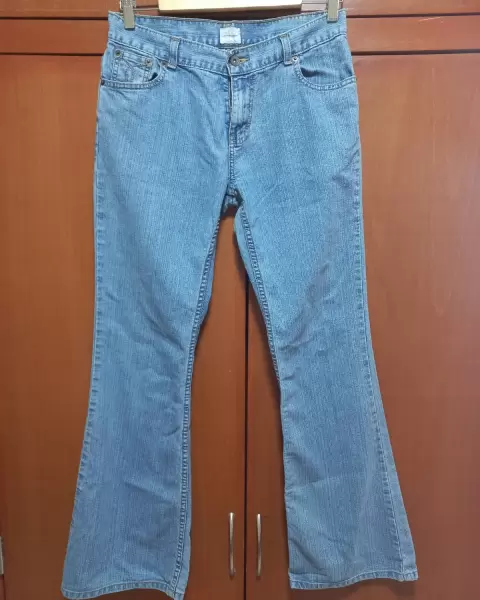 Jrans acampanados, marca Calvin Klein, corte clásico, mezclilla clara, talla 9, en perfecto estado.De contorno total de cintura mide 79 cm, tiro por la parte de adelante 22 cm, tiro por la parte de atrás 32 cm, largo 104 cm.