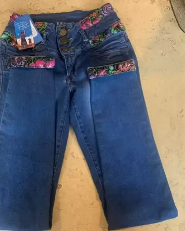 Bonito Jeans color azul, sin bolsas, atrech y estampado flores, entubado, cadera baja talla 7, de regalo body blanco que se ve en la foto