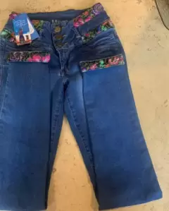 Jeans Ay Güey con estampado de flores. Bonito Jeans color azul, sin bolsas, atrech y estampado flores, entubado, cadera baja talla 7, de regalo body blanco que se ve en la foto