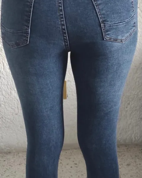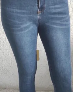 Jeans azul deshilado. Jeans tiro alto, tipo leggin y con terminación deshilado, tela estrech