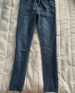 Jeans tiro alto, tipo leggin y con terminación deshilado, tela estrech