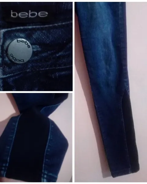 Jeans Bebe. De mezclilla, entubados, quedan abajito del ombligo, de uso pero en buen estado ningun detalle grave que mencionar, tienen mucho stretch por lo que si eres delgada pero con cadera te quedarían perfectos, en la parte de abajo a los costados trae adorno de tela negra, talla S.