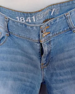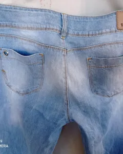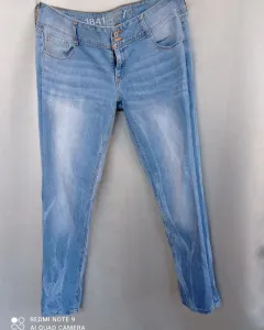 Jeans deslavados, no tiene strech, viene amplio, azul claro con deslavados.