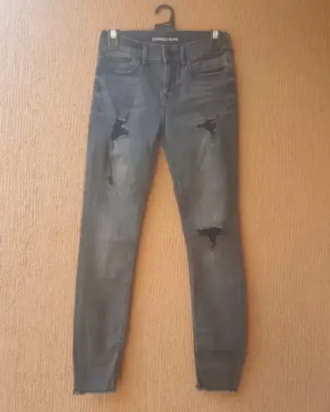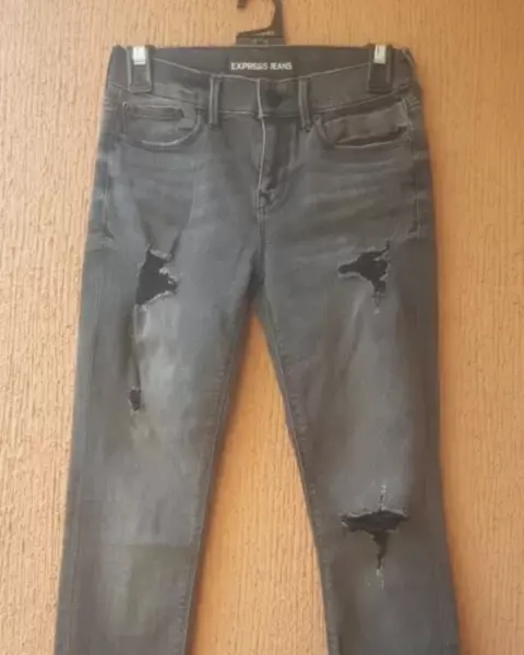 Jeans destroyed Express. Bonito pantalón en color gris avejentado, conrasgados localizados cintura media, con bastantestretch*Talla 0R pero puede quedar como a 3-5 ya que estira mucho*Medidas: Cintura 34cm. Cadera 41cm*Sin detalles*Calificación: 10*