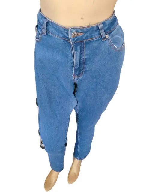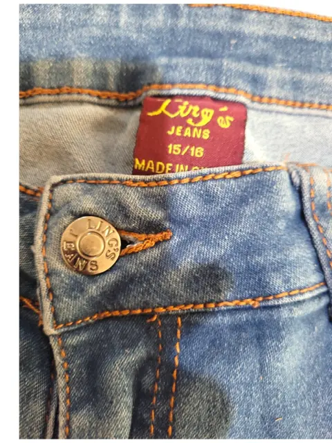 Jeans Entubados Lings, talla Extra grande 15/16, color azul marino claro, estilo clásico, 5-bolsillos, pretillas para cinturon, botones metalicos con logo, hecho de algodón y poliéster, mide 38cm de cintura, 52cm de cadera, 74cm de entrepierna con 99cm de largo de la cintura hacia abajo en buen estado cosmetico.
