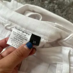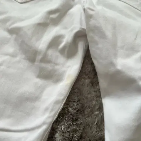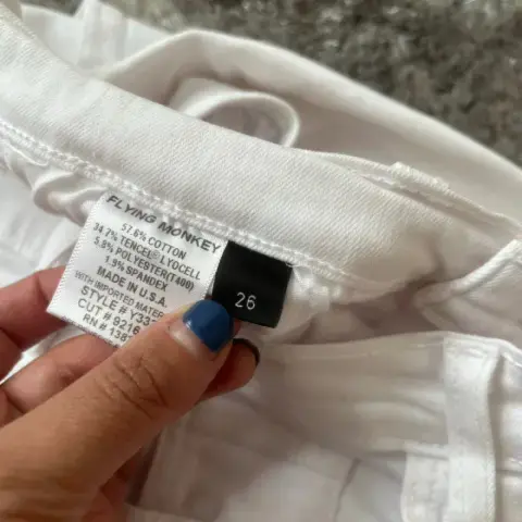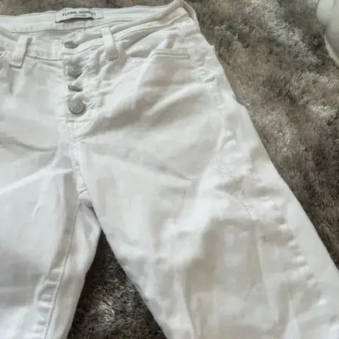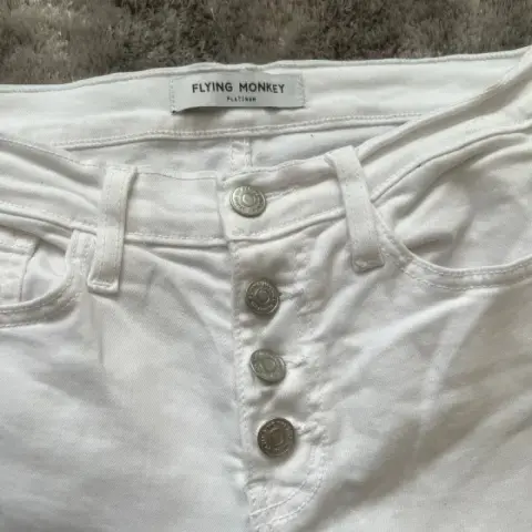 Jeans Flying Monkey blancos. Estos jeans son de una tela stresh muy suave, son de botones al frente, talla 26, tiene aún detalle de donde le quite la etiqueta y con una leve mancha amarilla