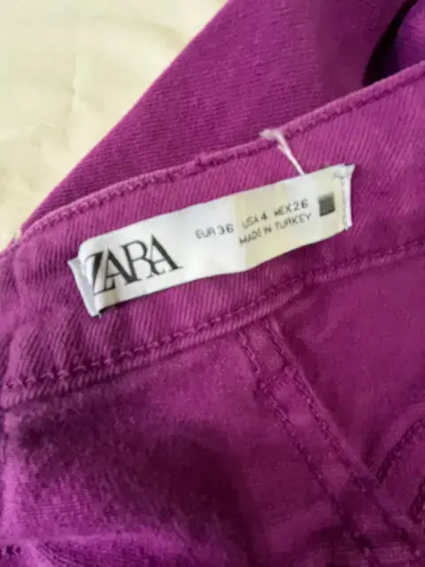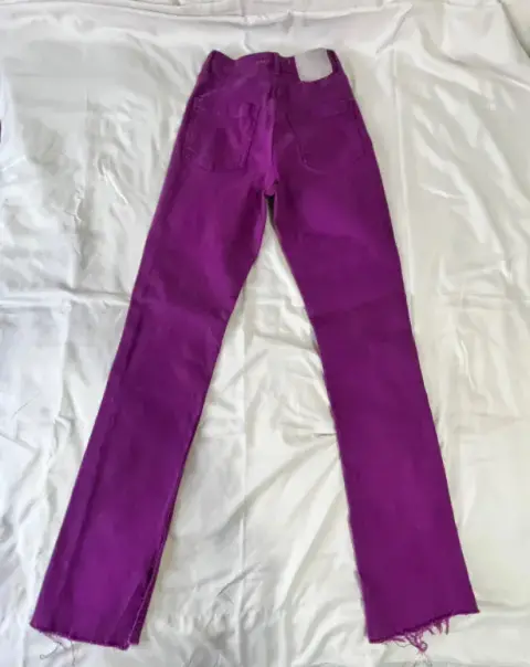 Jeans morados, rectos y ajustados de la parte súperior, no tienen bastilla, así es el modelo.