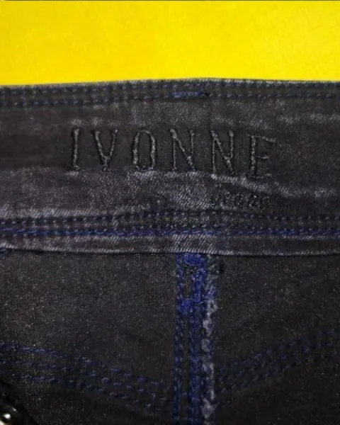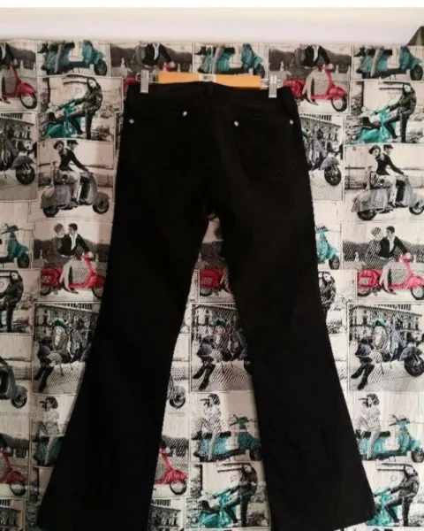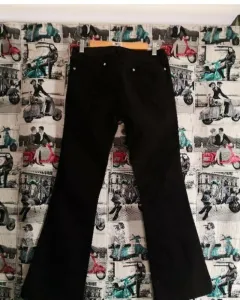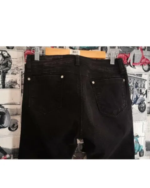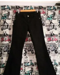 Pantalón de mezclilla negro, cintura media, acampanado. Bolsas frontales de adorno. Corte levanta pompa.