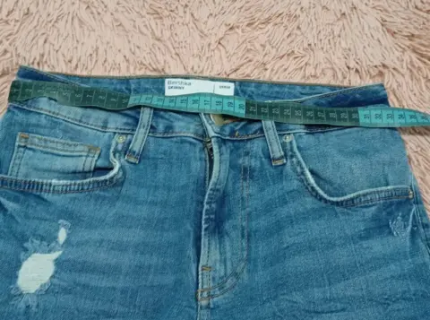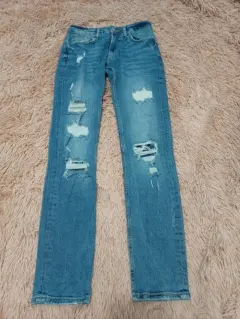 Lindo jeans berhka, rasgado, hace bonita figura,está en buen estado, es recto pero queda justo de las pantorrillas, estira, las medidas están en las fotos, dice talla 28 pero queda amejor a 25-26