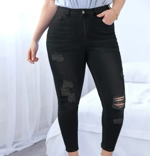 Jeans de mezclilla strech negro con rasgado en la pierna corte slim