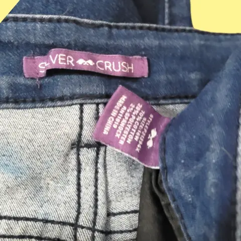 Jeans rectos Silver Crush, talla 42, color azul marino, estilo clasico, 5-bolsillos enfrente y atras, cierre y boton, pretillas para cinturon, tiro alto, tela elastica, hechos de algodón, poliester y espandex, mide 42cm de cintura, 51cm de cadera, 70cm de entrepierna con 99cm de largo de la cintura hacia abajo en buen estado cosmetico.