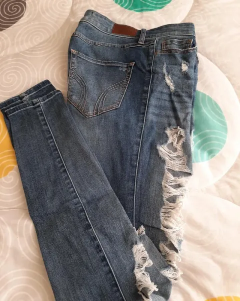 Jeans rotos entubado. Jeans azul con detalles de rojo. Tiro alto y entubado. Queda a 30 -32 en talla mexicana