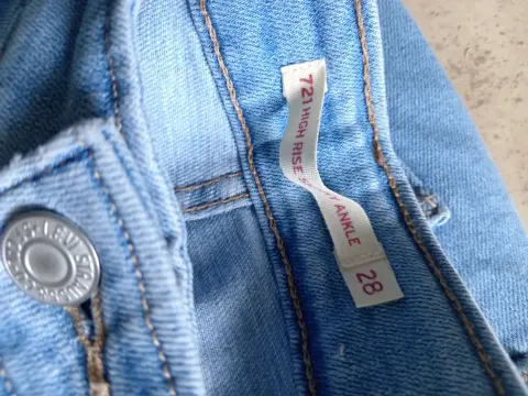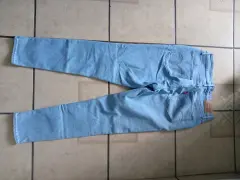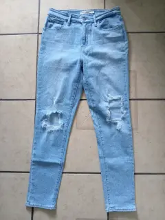 Skinny, high rise, largo a los tobillos, con rotos en las rodillas. Muy en tendencia. Azul claro.