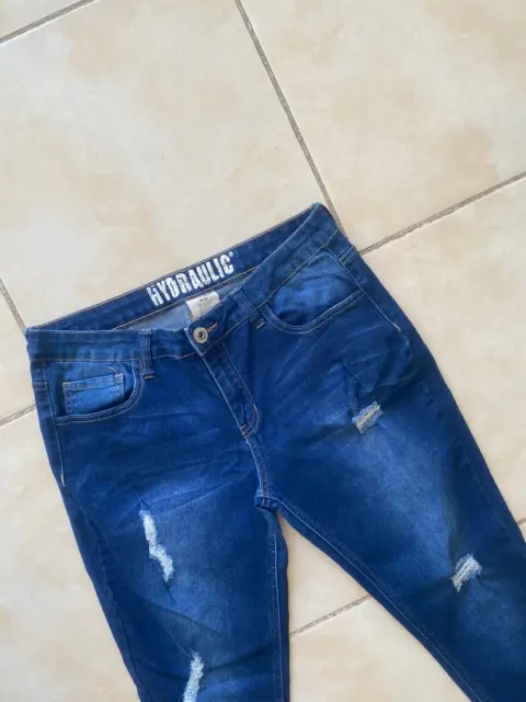 Jeans strech tiro alto. Padrísimos jeans con efecto destruccion de Hydraulic, 1 puesta, cero detalles, es strech! Es a la cintura. Cero desgastados de la entrepierna, como nuevos !MEDIDAS:✅cintura🟰44 cm.✅cadera🟰51 cm.✅tiro🟰23 cm✅largo total🟰96 cm.