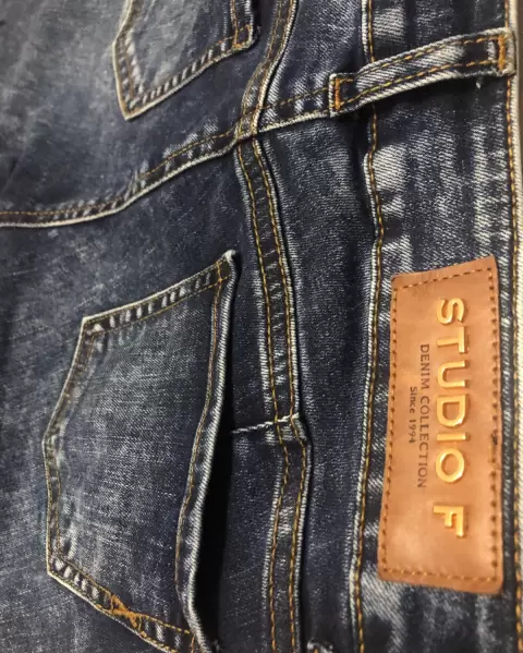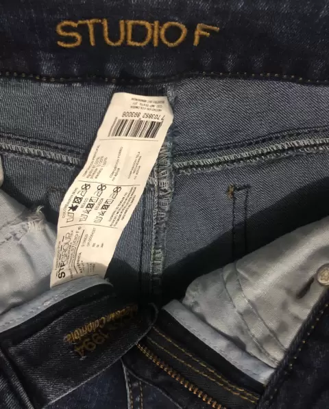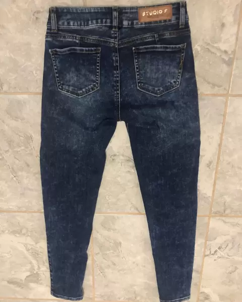Jeans Studio F. Tiene literal una puesta, la tela del jeans es strech, y horma perfecto al cuerpo, tiro medio, con pinzas que levantan la pompa y estiliza las piernas, con bolsillos.