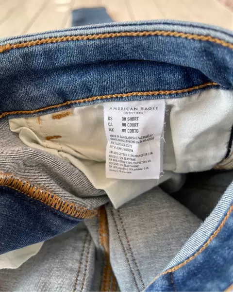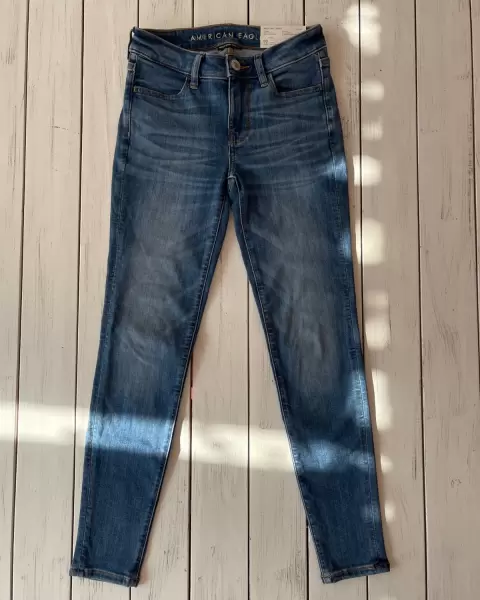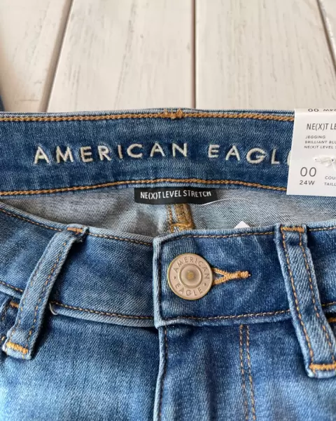 Jeans tipo jeggin American Eagle. Jeans tipo jegginTalla: 00 shortBrilliant blueMedidas: 30.5 cm cintura, 33 cm de cadera (de costura acostura), 20.5 cm de tiro y 68 cm de entrepierna.Ajuste medio (ni a la cintura, ni a la cadera)Stretch