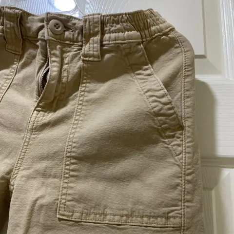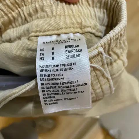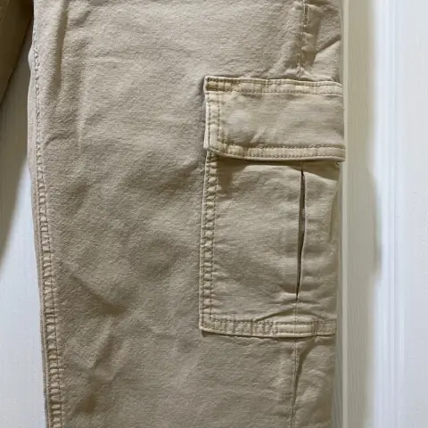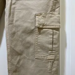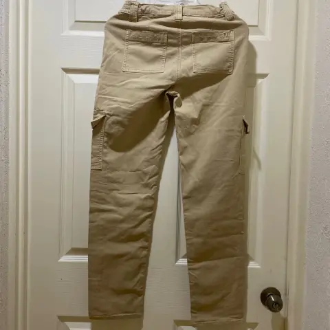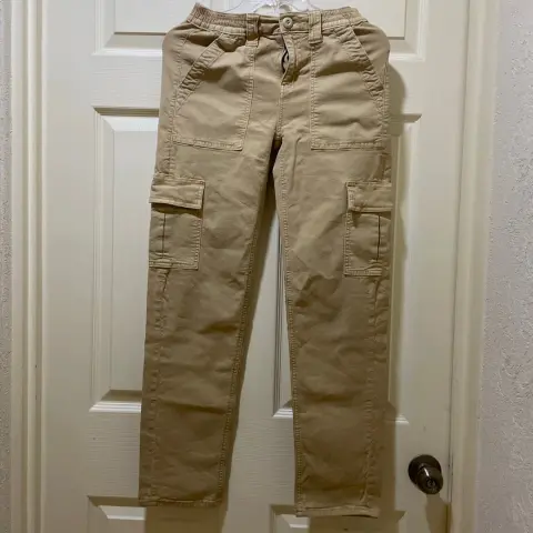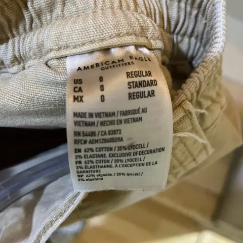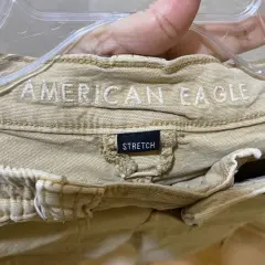 Jeans tipo jogger en color caqui. Con bolsillos externos laterales. Marca American Eagle. Talla 0.
