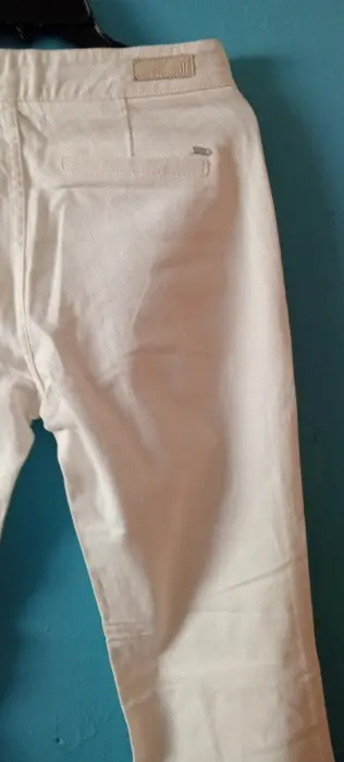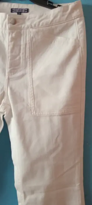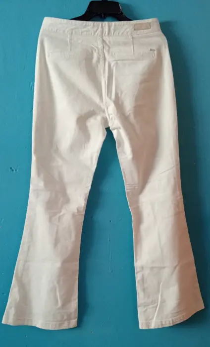 Pantalón con bolsillos al frente. Cierre de zíper con botón y piernas acampanadas.