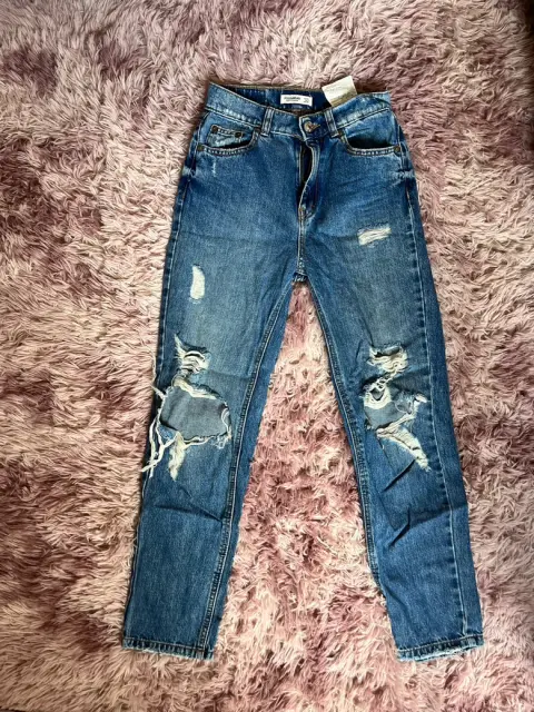 Jeans tipo mom fit con rasgado, de mezclilla azul, tiene bolsas frontales y traseras.