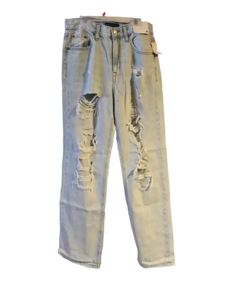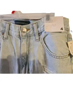 Jeans color azúl claro aeropostale , mom jeans con detalles rotillos al frente , talla 10 . Tela strech