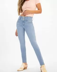 Pantalla skinny azul. Jeans de mezclilla cintura media, llega al ombligo, levanta los glúteos por las pinzas de atrás.