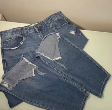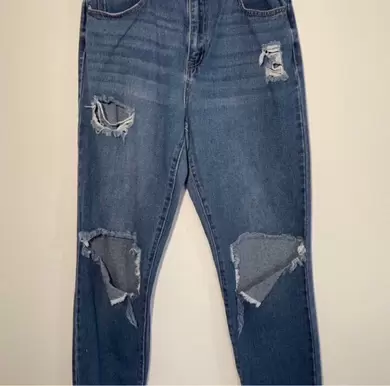 Pantalón de mezclilla boyfriend, tiro alto, roto y deshilachado. Detalle en la parte del cinto, se puede coser. Queda hermoso y perfecto para cualquier temporada 🤩🤩