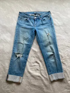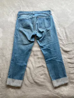 Pantalón de mezclilla. Pantalón tipo capri roto de la rodilla con dobladillo doblado
