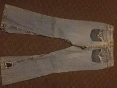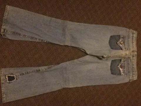 Pantalón de mezclilla con parches como adornos, color azul, las piernas tienen terminación rectas, bolsas en la parte de atrás, talla 11
