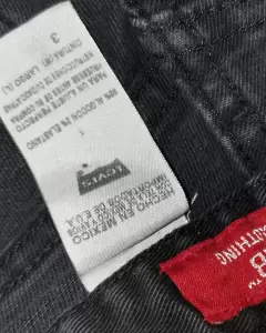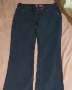 Pantalón de mezclilla acampanado. Es negro aunque se ha desgastado un poco el color, lo compre de medio uso pero no me quedó.Es de botones en la parte de adelante, es decir no tiene cierres. Tela de mezclilla gruesa, la talla quizá queda a una 5