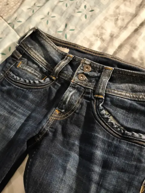 Pantalón de Mezclilla Pepe Jeans, talla cintura 27 largo 32 azul obscuro con pequeños destellos de deslavados, pretina ancha