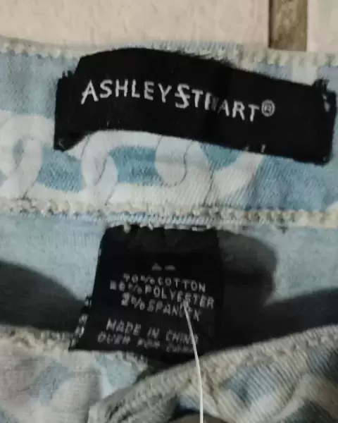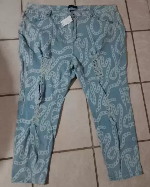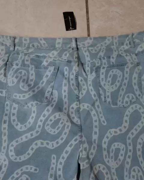 Pantalón de mezclilla strech con diseño de cadenas en color azul claro y detalles de desgaste, completamente nuevo talla 26W muy amplio.