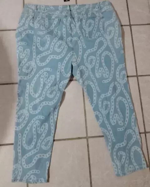 Pantalón de mezclilla diseño de cadenas. Pantalón de mezclilla strech con diseño de cadenas en color azul claro y detalles de desgaste, completamente nuevo talla 26W muy amplio.