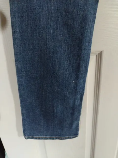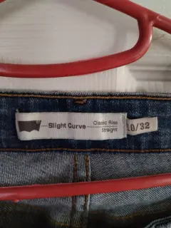Pantalón de mezclilla azul, corte a la cintura, pierna recta, con bolsas atrás y adelante, talla 32 slight curve, estreigs, en muy buen estado