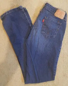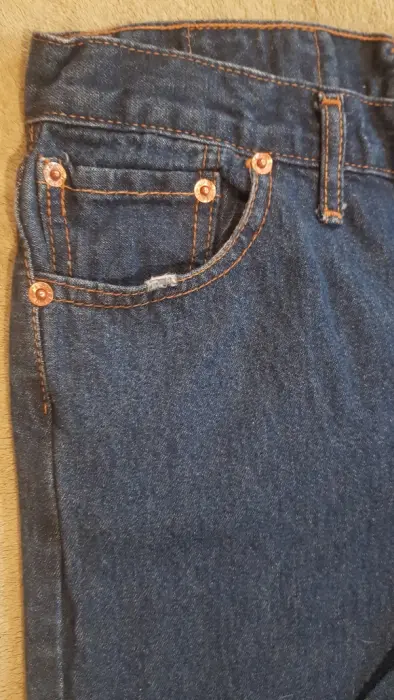 Clásico pantalón de mezclilla corte pierna recto, con bolsas frontales y traseras, detalle de fábrica en la bolsa (se ve en una de las fotos)