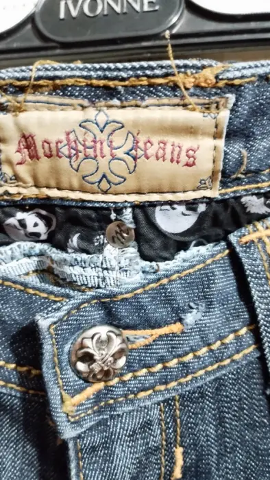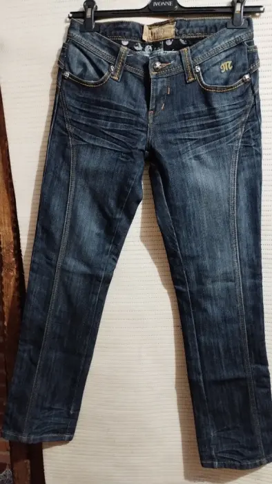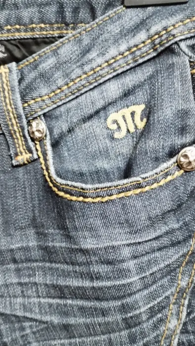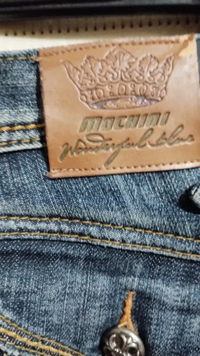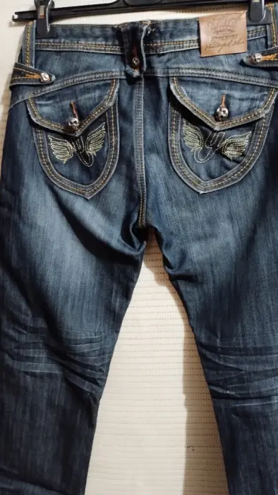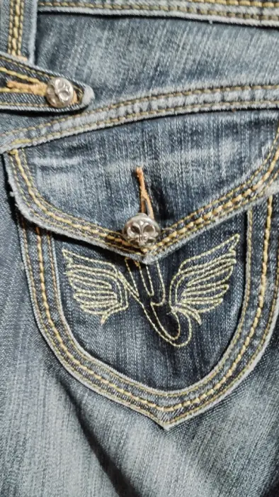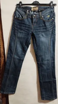 Jean azul deslavado, con detalles arrugados en la tela , mezclilla gruesa con elastano , bolsas traseras y delanteras . Costura en las piernas que moldea . Recto o boucout.