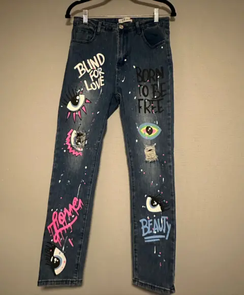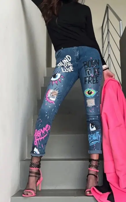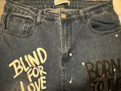 El jeans más cool con strech y estampados, parches de ojo & Blind for Love, talla L