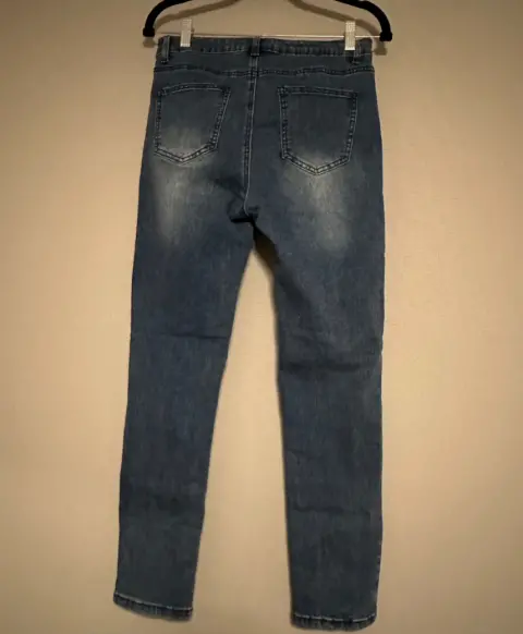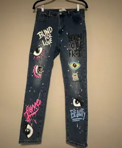 Pantalón de mezclilla strech con estampado. El jeans más cool con strech y estampados, parches de ojo & Blind for Love, talla L