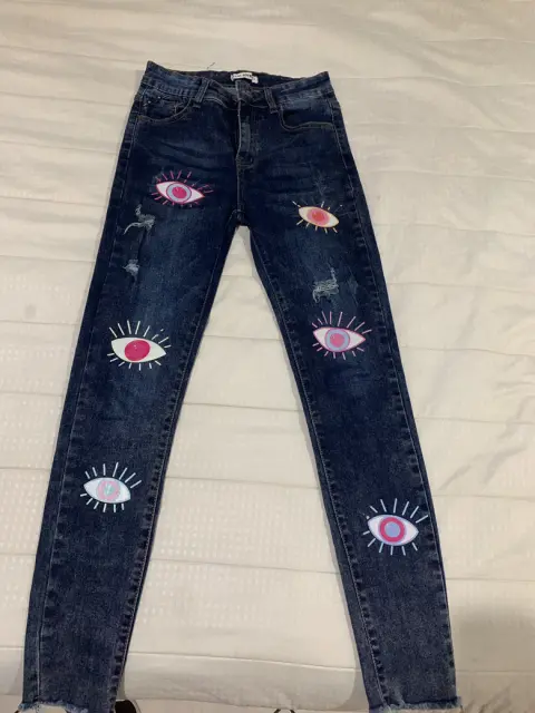 Pantalón de moda. Pantalón mezclilla con ojitos buena mezclilla, viene marcado talla (S) queda 3-5