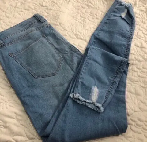 Sin detalle alguno es nuevo sin etiqueta muy lindo tiene bolsas traseras azul cielo es tipo strechs amolda súper bien al cuerpo