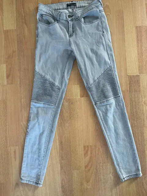 Pantalón gris claro shasa la mezclilla estira , en las rodillas tiene textura corte recto