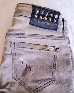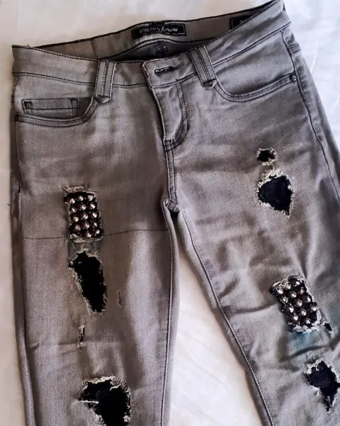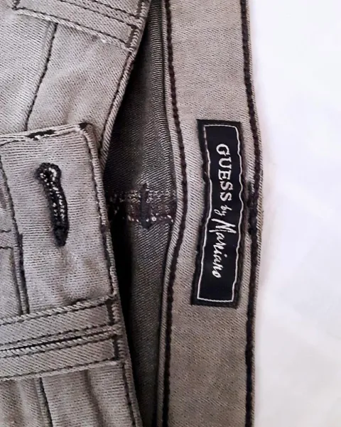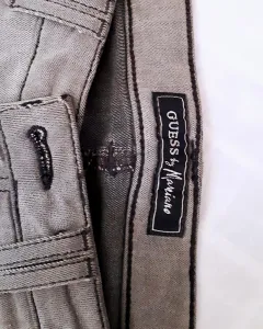 Pantalón GUESS Skinny gray. Pantalón Guess skinny con estoperoles, efecto deslavado. Cierre con botón y cremallera, con emblema metalizado en uno de los bolsillos. Corte straight crop, color gris deslavado.Queda de talla 3 a 4.