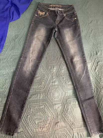Pantalón mezclilla. Pantalón de mezclilla con detalles de perlitas, es oscuro como degradado, chico, bonito