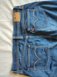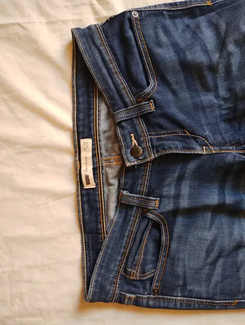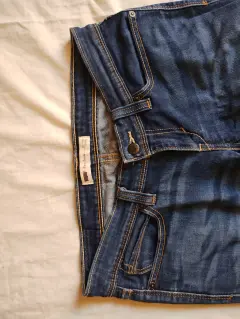 Pantalón de mezclilla Levi's. Entubado, a la cadera. Detalle: La tela se encuentra estirada, sobre todo de la parte trasera (foto 5) y de la parte de enmedio se visualiza un desgaste (foto 4).