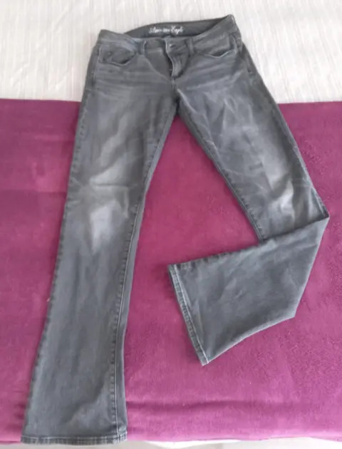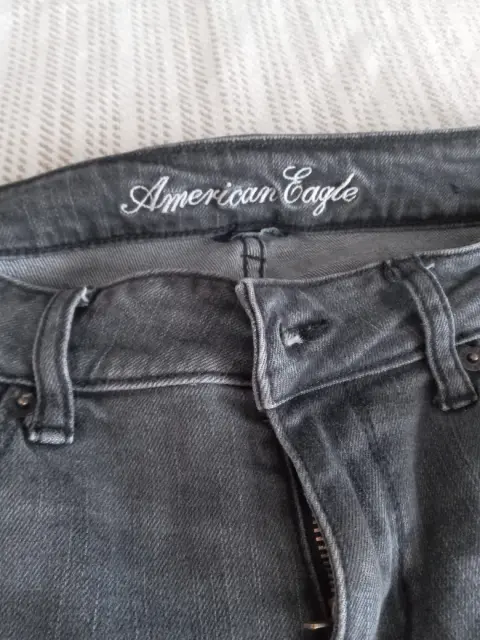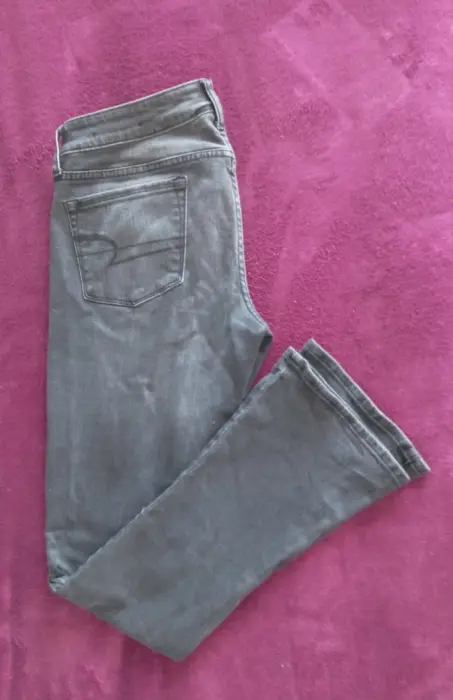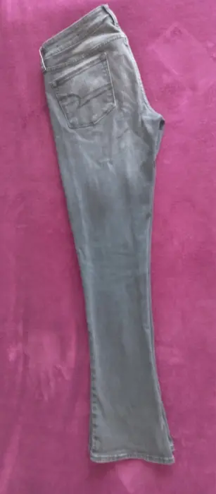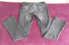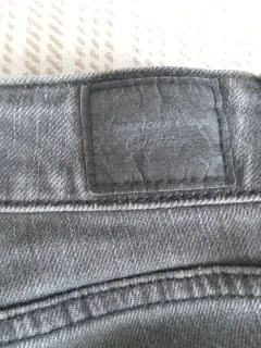Pantalón de mezclilla color negro deslavado, así es el color.Es ligeramente acampanado con tiro altoDe uso pero en perfecto estado, sin ningun detalle