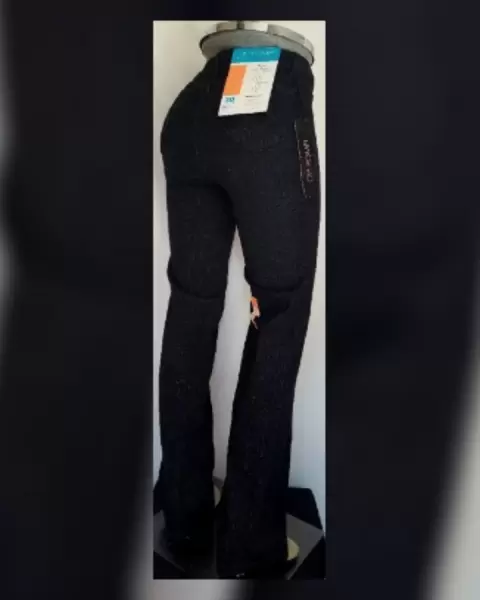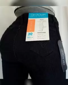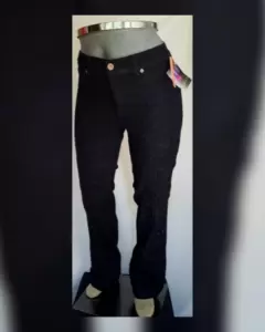 Pantalón mezclilla stretch tipo straight, cintura alta color NEGRO ÉBANO efecto raya diplomática, pretina c/trabillas, cierre p/cremallera y botonadura lacrada tono plata patinada, 2 bolsillos frontales simulados y 1 mini bolsillo, 2 bolsos traseros. Talla 30. Dimensiones cms: 36 cintura, 24 tiro, 41.5 cadera, 24 pierna, 108 largo. 69% algodón, 30% poliéster, 1% elastano. P/lavado en casa.