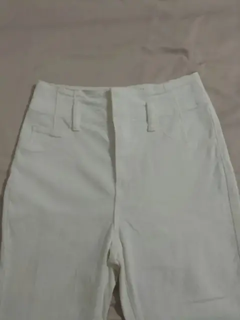 Pantalón mezclilla tiro alto T -28. Pantalon Mezclilla talla 28 pero viene amplio tiro alto color blanco sin botón con broche y cierre se puede usar con cinturón o solo, mide 35 cm de cintura alta , 40 cm de cintura media 45 de cadera recuerden k es al doble k da la medida solo medi la parte frontal